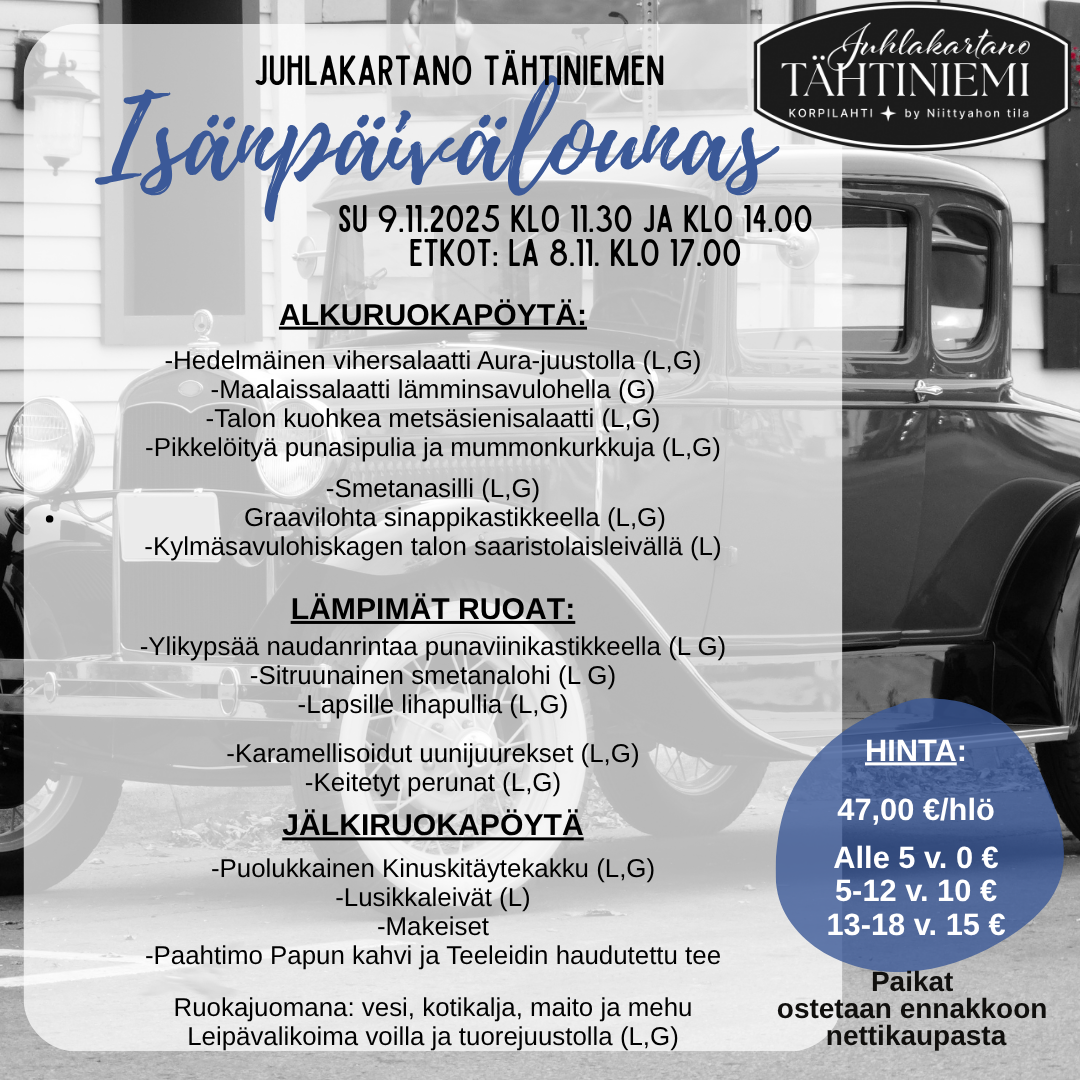 Juhlakartano Tähtiniemen isänpäivälounas katetaan su 9.11.2025 klo 11.30 ja klo 14.00. Lisäksi varsinaisen juhlapäivän kiirettä helpottamaan tarjoamme saman menun myös päivällisen muodossa jo la 8.11. klo 17 alkaen. Tutustuthan menuun lisäkuvista alla.