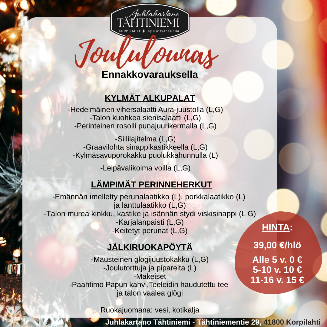 Tällä hetkellä perhejuhlia, joululounaita, pikkujouluja, tyhyjä yms. voi kysellä juhlakartano.tahtiniemi@hotmail.com