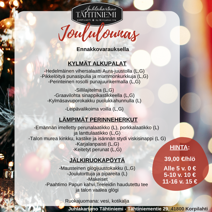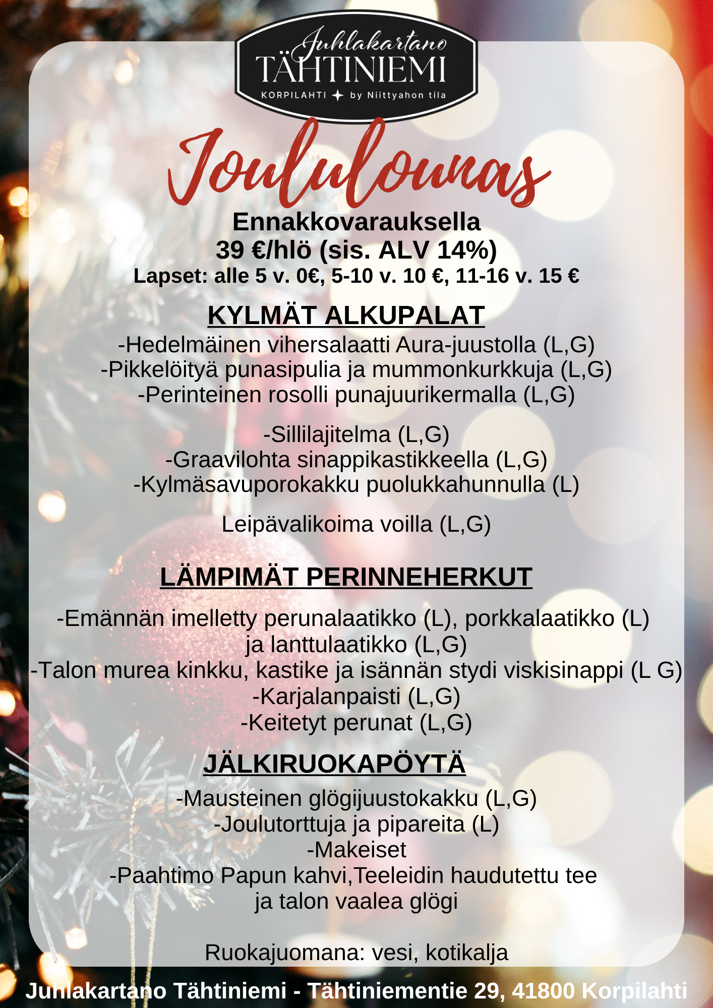 Tervetuloa viettämään lämminhenkinen juhlahetki perheen ja läheisten kesken kauniissa ja tunnelmallisessa Juhlakartano Tähtiniemessä Korpilahdella. Täällä kohtaavat herkullinen ruoka, kiireetön tunnelma ja juhlan tuntu.