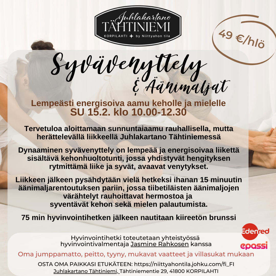 Hyvinvointihetket sopivat myös hyvin yrityksille ja yhteisöille! Pienemmällä porukalla voi hyvin tulla osaksi yleistä tilaisuutta tai isommalla porukalla varata oman ajankohdan. Kysy omaa Tyhy-hetkeä: juhlakartano.tahtiniemi@hotmail.com